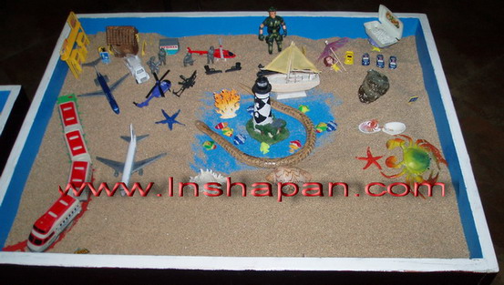 中间一片小海,一个灯塔、小帆船,船头冲上,右下角一个草房、两架飞机(后被挪走)几条小鱼在水中,飞机又回来了,把沙展平,一个士兵在沙盘下方,海中有珊瑚。